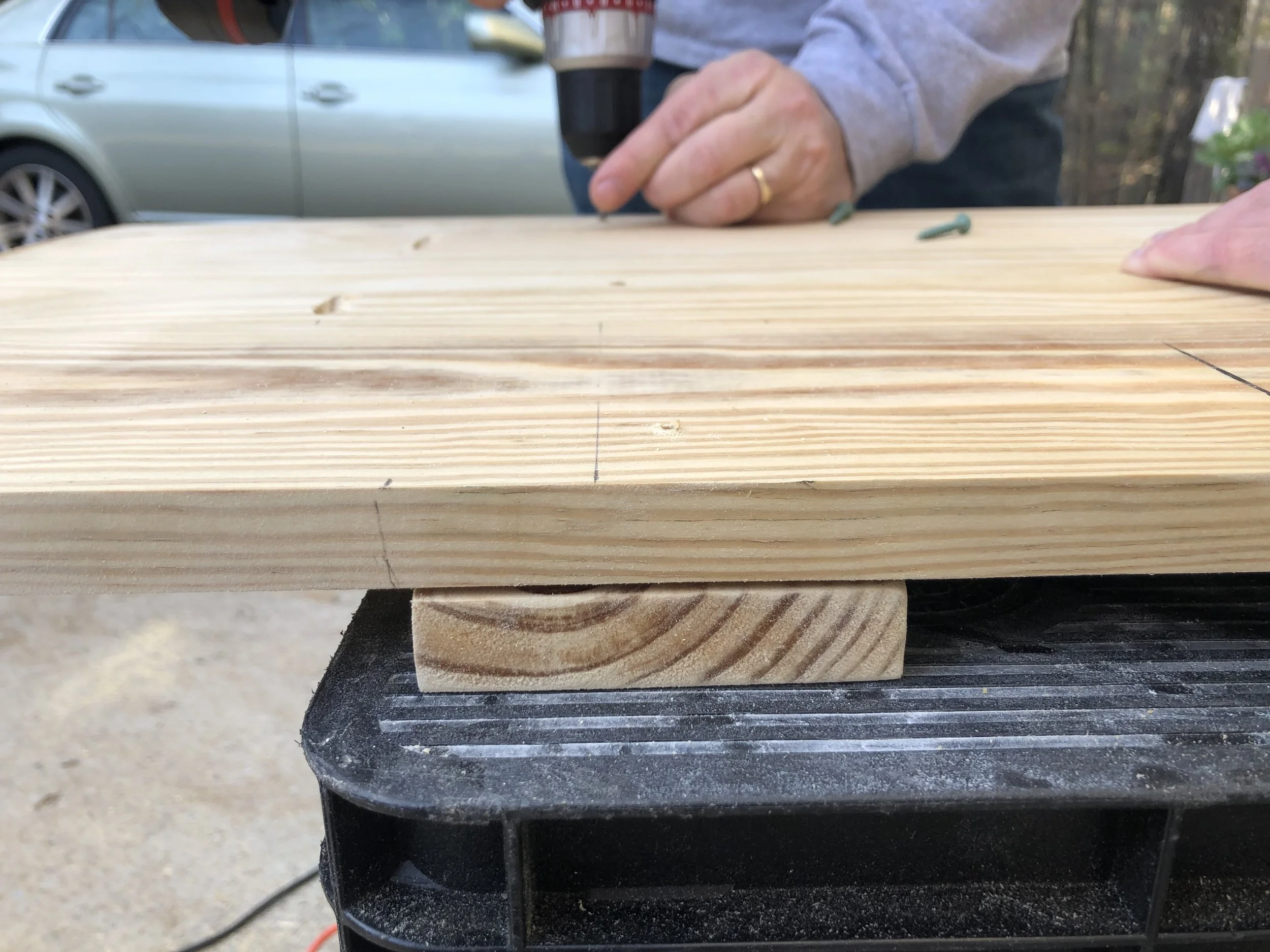 Drill your pocket holes using the Kreg Jig drill attachment. I put the wood on the saw horses and used some wood clamps to help secure the Kreg Jig. I chose to do 3 different pocket holes on each board to add extra security. Make sure to measure equidistance between each pocket hole. Once you’ve drilled all the pocket holes, take your 1 ¼” kreg jigs screws and screw each board together and you should end up with something like this.